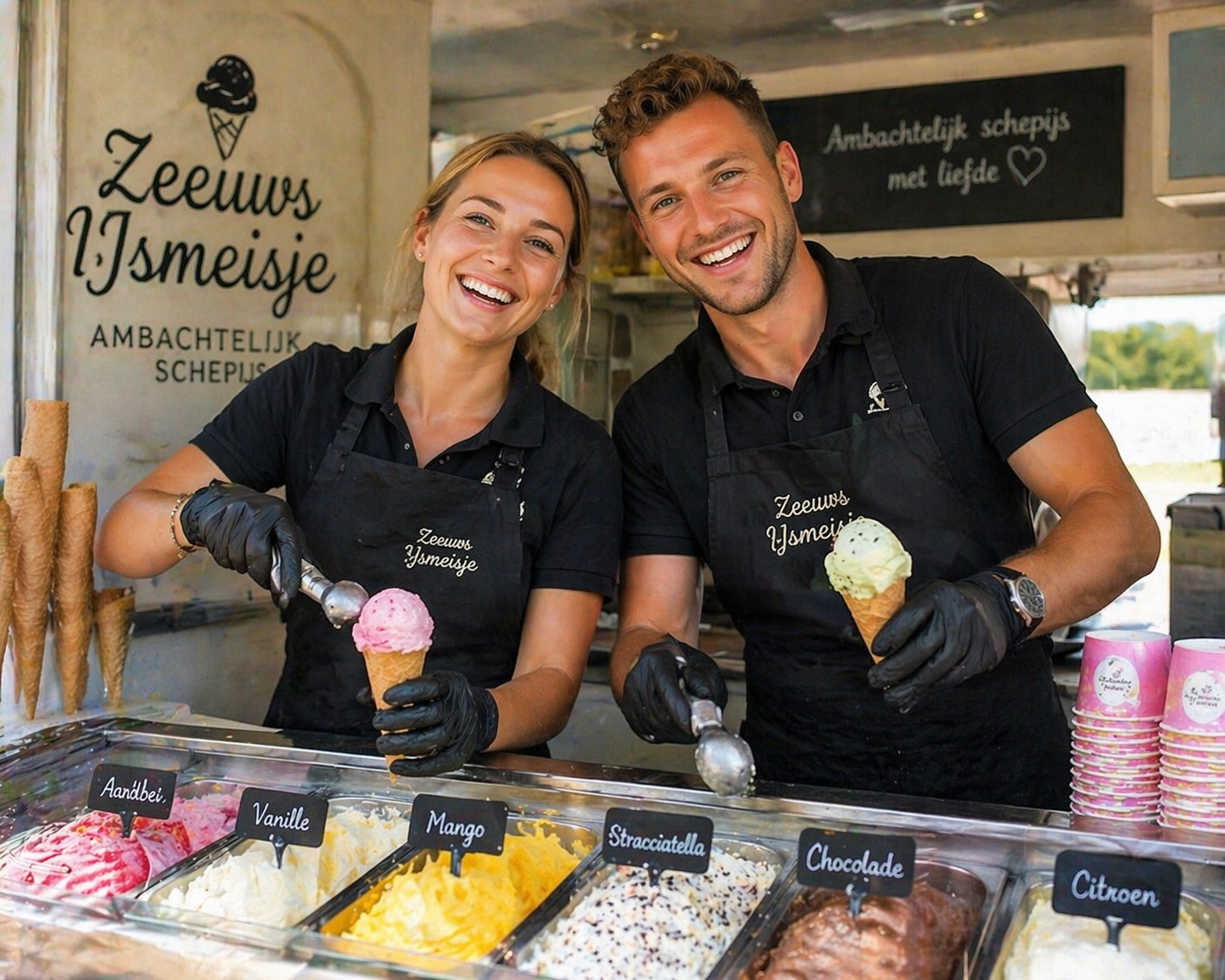 Bij het reserveren van onze ijswagen is een vriendelijke ijsschepper inbegrepen. Zij zorgen voor een professionele en gastvrije bediening van jullie gasten op het bedrijfsfeest.